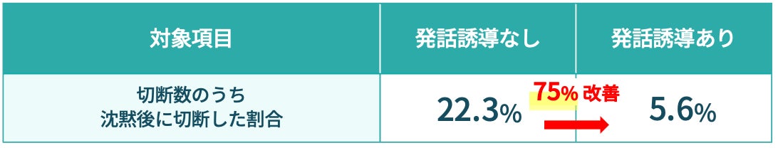 発話誘導を用いることで、切断数を減らすことができることがわかりました。また、切断したユーザーの中で沈黙しているユーザーに絞って調べたところ、切断数が75%改善していることが判明しました。
