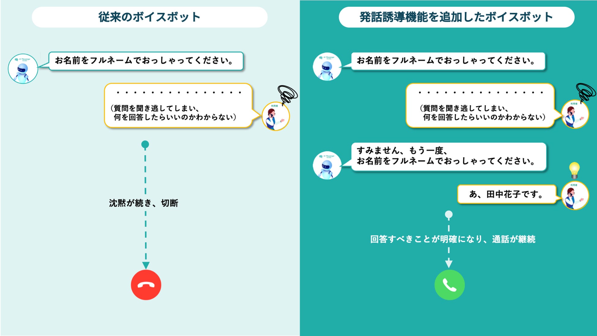 発話誘導機能は、ボイスボットからの質問に対して、一定時間の沈黙が経過した場合、ユーザーへ発話を促します。
