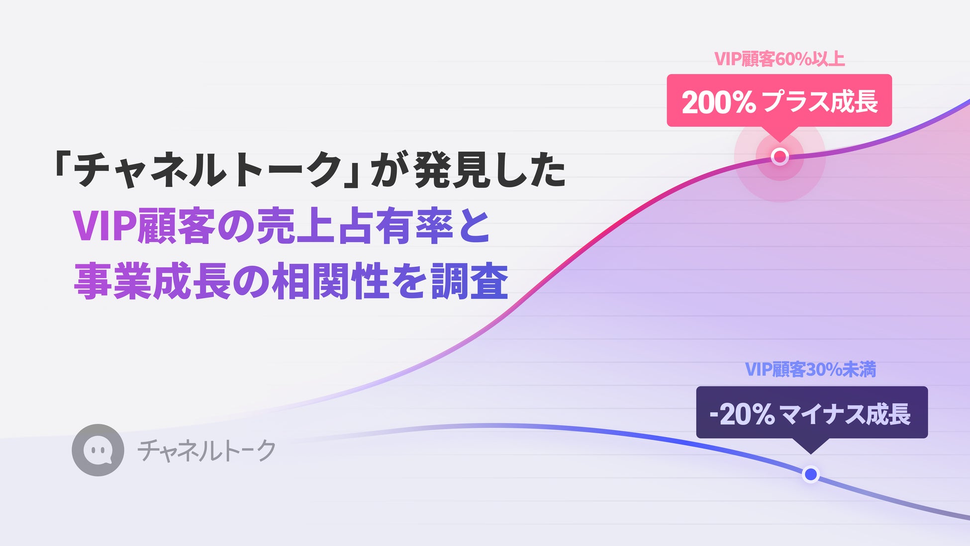 All-in-one顧客コミュニケーションツールの「チャネルトーク(https://channel.io/ja)」(株式会社Channel Corporation、所在地:東京都中央区、CEO:玉川葉、以下「チャネルトーク」)は、パレートの法則に基づき、売上上位20%の顧客(以下、VIP顧客)が80%の売上を創出している企業が健全に成長しているのかを検証するために、チャネルトークを利用中の事業者68社を対象に「全体売上のうち、VIPが占める売上割合」と「売上成長率」の関係性を調査しました。