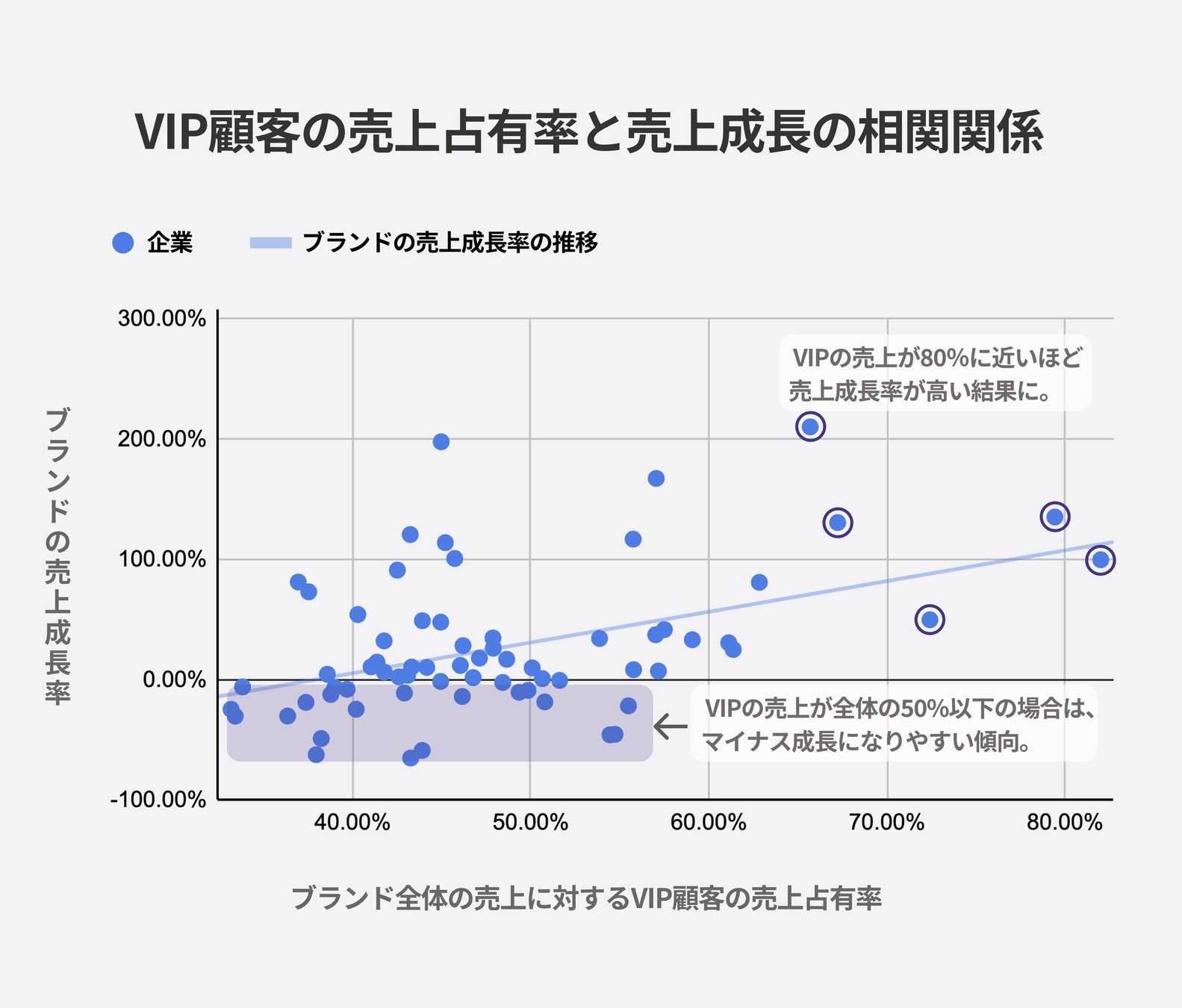 以下のグラフの通り、調査対象企業の半期の売上成長率を縦軸、VIP顧客の売上占有率を横軸として配置をしたところ、VIP顧客の売上占有率が高いほど、売上成長率が高いという結果に至りました。中には、200%成長する企業もあり、VIP顧客の重要性がデータからわかります。そして、VIP顧客の売上占有率が60%を超えている企業はすべてプラス成長をしており、下回るほどにマイナス成長する企業が増える傾向にあるということがわかりました。