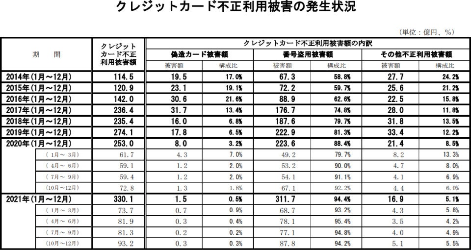 クレジットカードの不正利用被害額は年々増加しており、2021年には330億円を超えています。