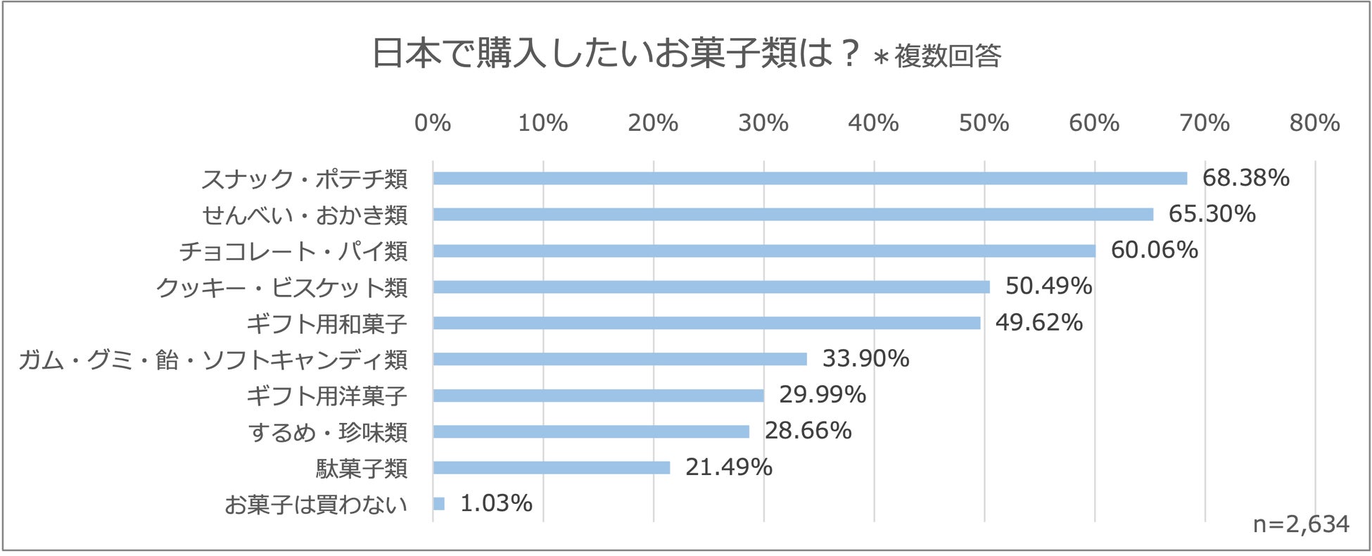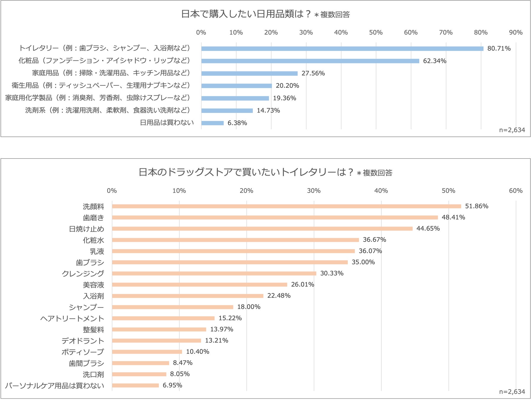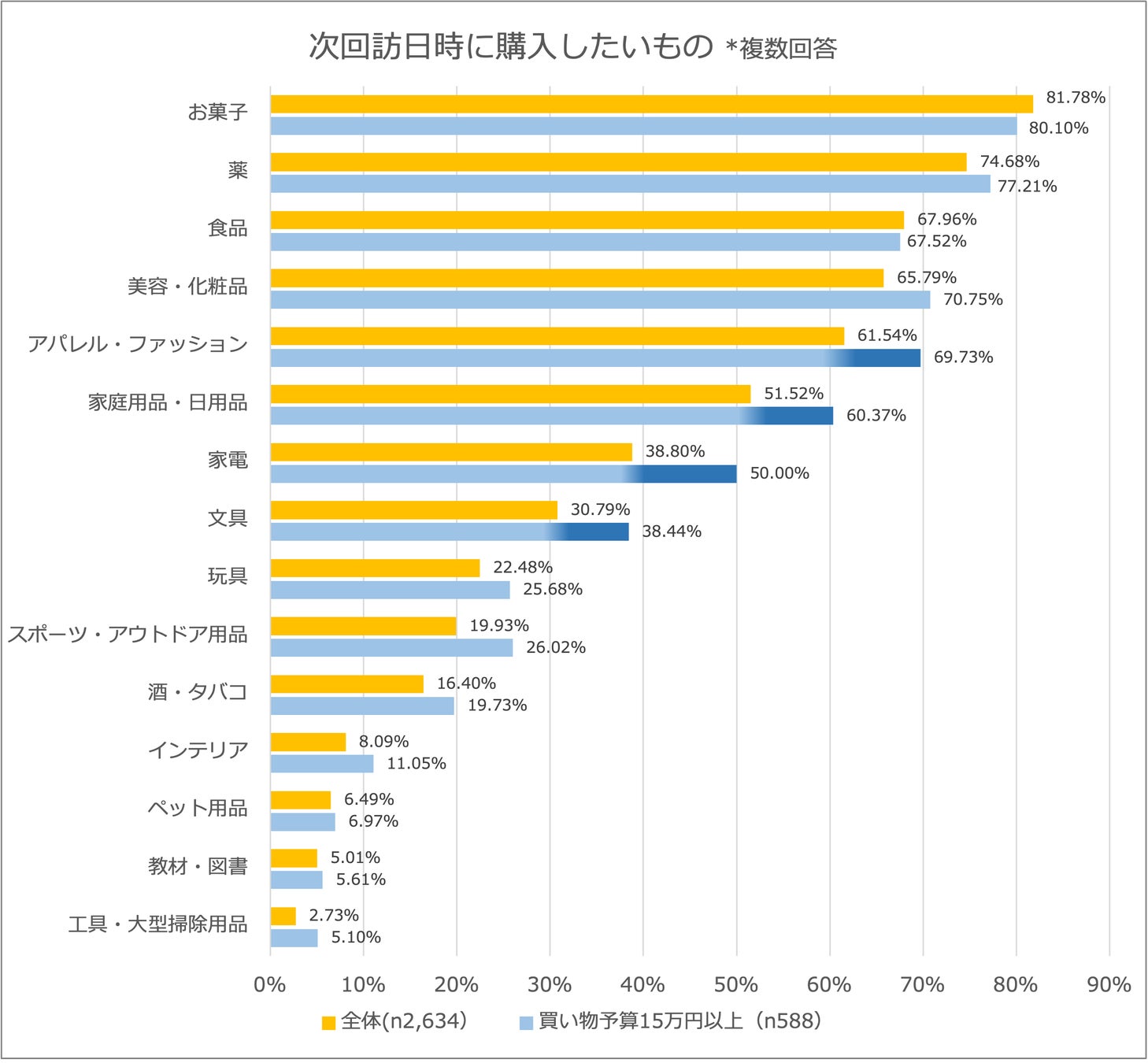 訪日時に購入したいものは、お菓子が81.78%で最も人気が高く、ついで薬(74.68%)、食品(67.96%)、美容・化粧品(65.79%)、アパレル・ファッション(61.54%)、家庭用品・日用品(51.52%)と続きました。