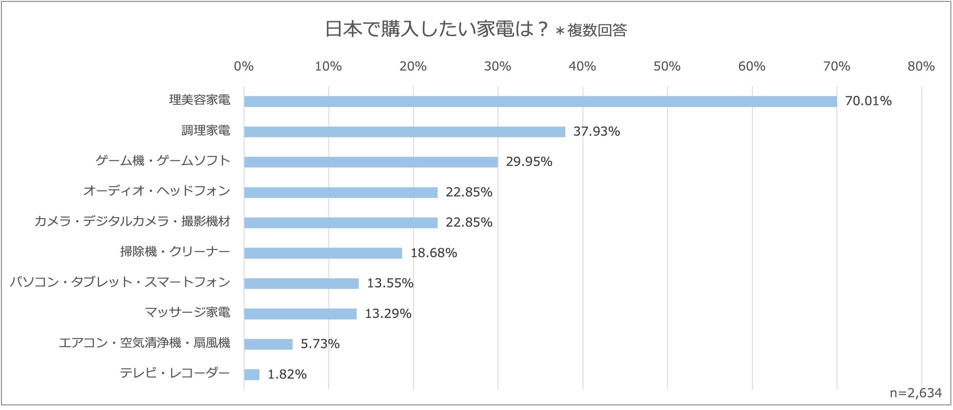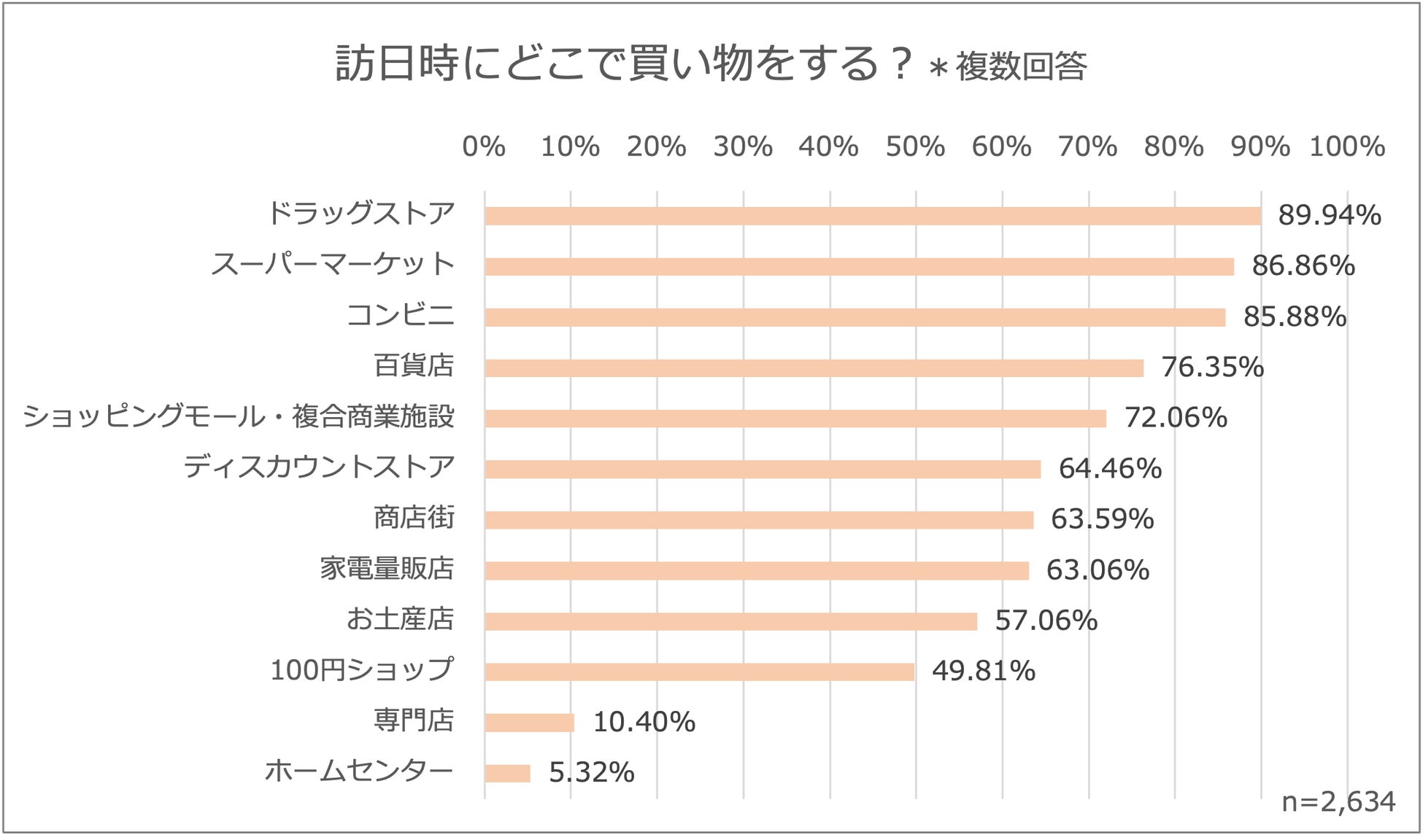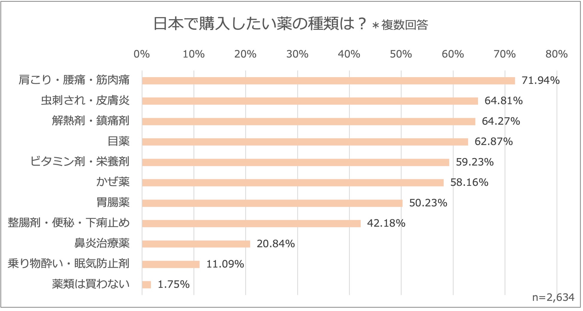訪日時に購入したいものは、お菓子が81.78%で最も人気が高く、ついで薬(74.68%)、食品(67.96%)、美容・化粧品(65.79%)、アパレル・ファッション(61.54%)、家庭用品・日用品(51.52%)と続きました。