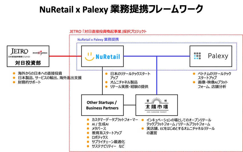 リテールテックスタートアップのNuRetail株式会社 (本社:東京都港区、代表取締役CEO:飯田健作)は、東南アジアを中心に事業展開するベトナムのリテールテックスタートアップのPalexy社と基本合意後業務提携を去る2023年4月3日に締結し、協業準備を進めてまいりました。この度、下記の三点を中心に業務提携の枠組みの中で協業をスタートさせることになりましたのでお知らせいたします。