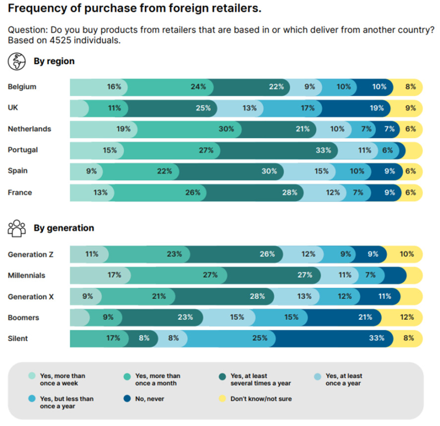 価格への感度が高まるほど、オンライン上で支出する額が大きくなっていることは、調査対象の6か国に共通していえます。そのうち、特にポルトガル(75%)とオランダ(70%)は、国外のECサイトで買い物をする人の割合が高いです。また、ミレニアル世代とZ世代を中心に、若年層においてこの傾向が顕著となっています。(下図)