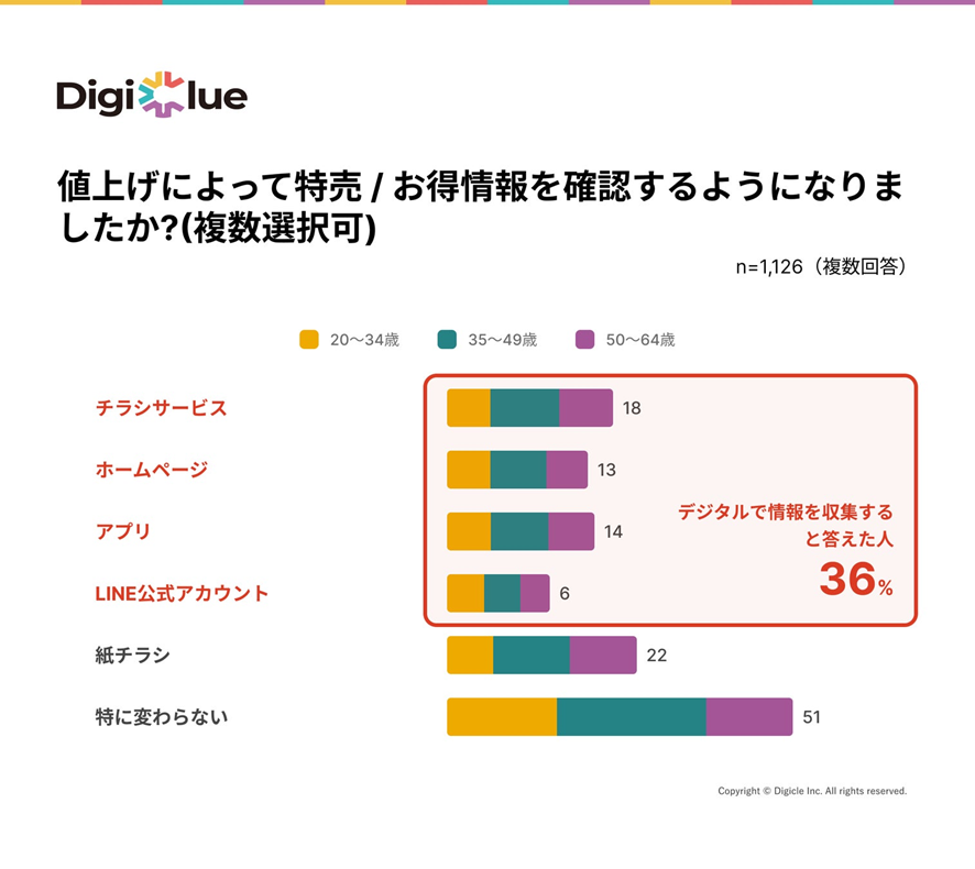 物価の高騰はヨーロッパに限らず、日本でも起きています。株式会社デジクルの調査によるとスーパーマーケットの値上げに対して、Web上で情報収集をするようになった人が36%いることがわかりました。スーパーマーケットのように店頭購入が基本となる業態であってもこの割合が出ていることから、他のカテゴリーの商品においてはよりWeb上で検索され、価格の安い商品を求める動きが活発になっていることが予測されます。