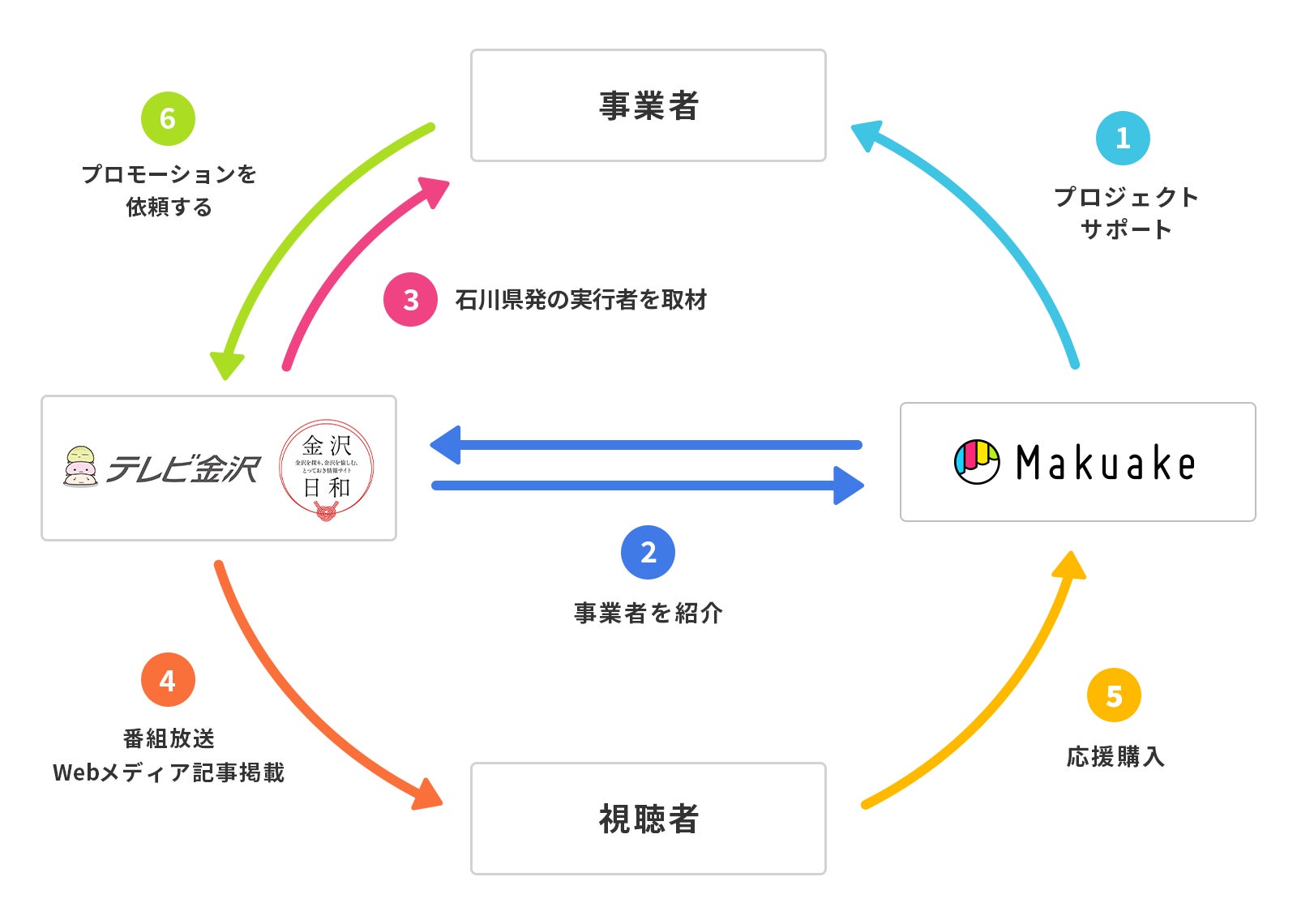 プロモーションを希望するプロジェクト実行者を当社からテレビ金沢へ紹介し、企画に合う魅力的なものを番組側がキュレーションして取り上げるプロジェクトを決定後、実行者への取材を進め、放送および記事掲載を行います。番組やWebメディアを見て実行者を応援したい、その製品やサービスが欲しい、と思った視聴者は、「Makuake」のプロジェクトを応援購入し、サポーターとしてプロジェクトに参加することで、実行者の挑戦を後押しします。