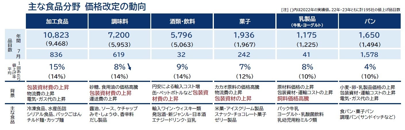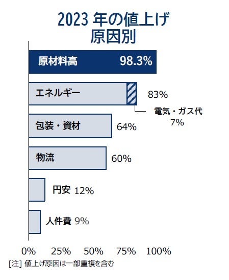 2023年の値上げは、原材料価格の高騰による影響は一部で落ち着きつつある半面、電気代や人件費、物流費の負担が徐々に増しており、値上げペースは引き続き高水準で推移している。