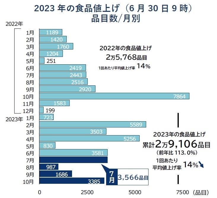 2023年7月単月の値上げ品目数は3566品目となった。前年7月(2443品目)から約1000品目・1.5倍増加し、今年に入って5回目となる3000品目超えとなった。8月以降の推移をみると、8月は乳価改定の影響を受けてパック牛乳やヨーグルトなど乳製品を中心に987品目、9月もチョコレート菓子など1686品目が値上げ予定となる。10月は、瓶など包装資材価格の上昇を背景に、日本酒やワインなど酒類を中心とした3385品目が値上げ予定で、4月以来半年ぶりに5000品目超えの値上げラッシュとなる可能性がある。