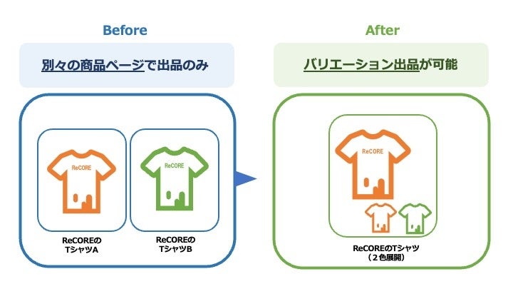 これまでは同ブランド・同型の商品でサイズ違いなどの在庫を出品販売する際、それぞれ個別に出品を行う方法でしたが、こちらによりサイズ・色違いなどの在庫管理を個別に行いながら、1度の出品になりエンドユーザーより購入もスムーズになります。
