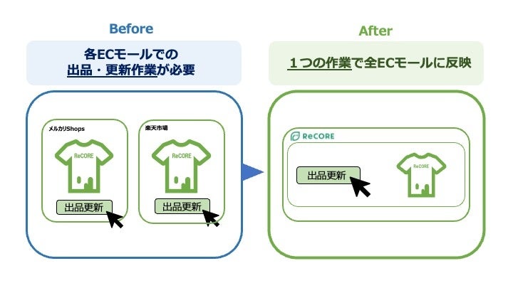 すでにReCOREでは、Amazon・楽天市場・ヤフーショッピング・ヤフオク!・メルカリShops・ラクマ・Shopifyにおいて、同時出品・在庫連携・受注管理に対応しています。