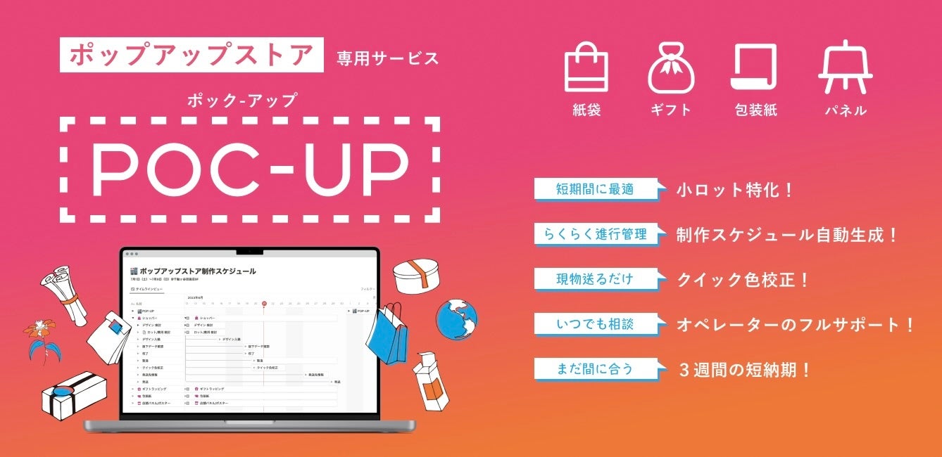 ポップアップの包装資材に絞り込み、制作スケジュールや色校正をシステム化することで最短3週間という短納期を実現します。