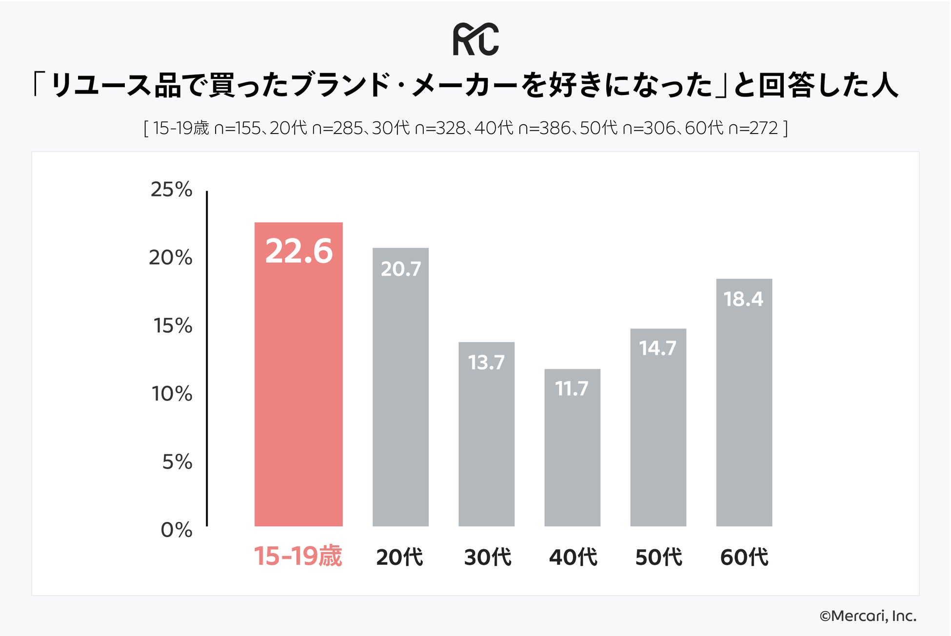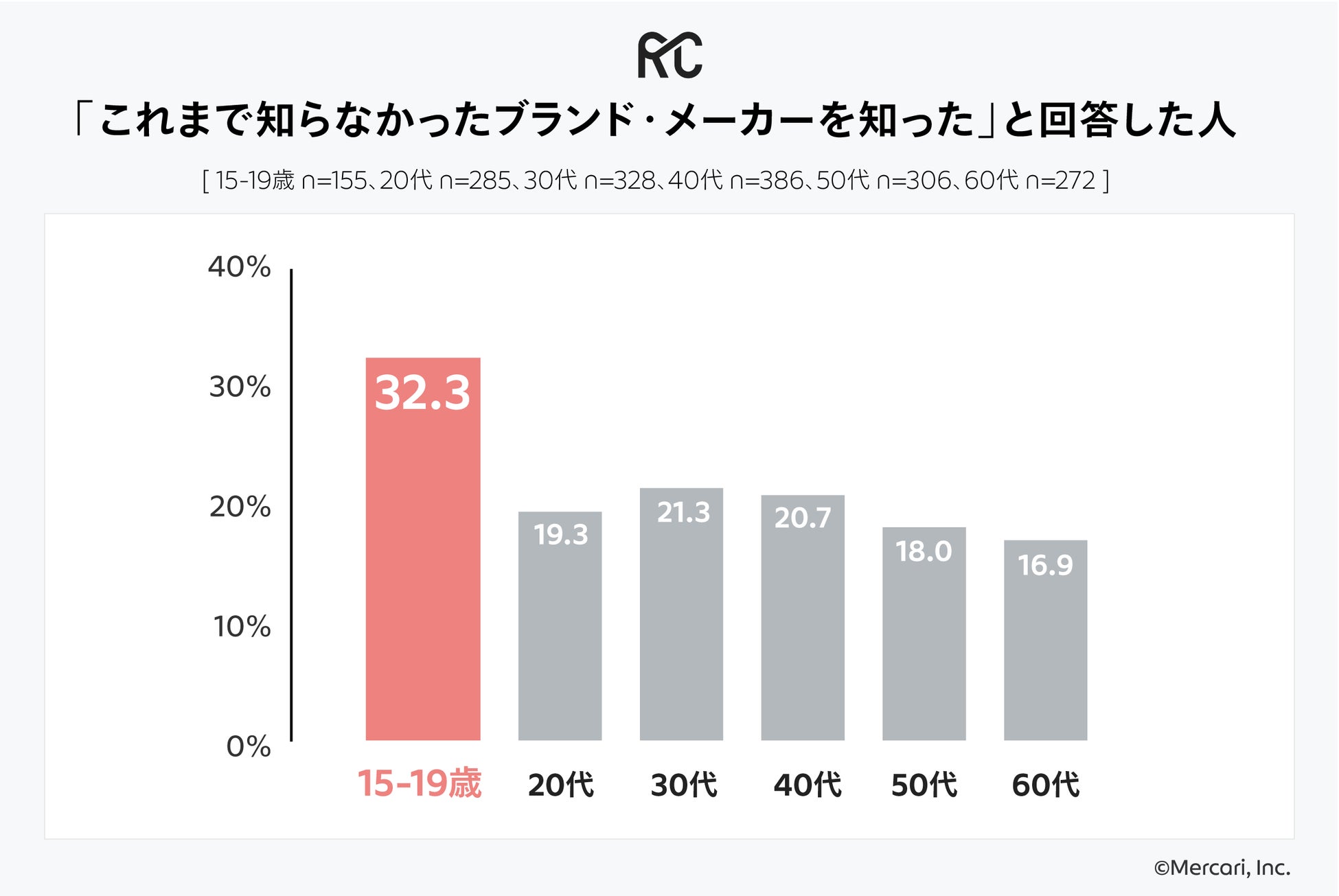 - 特に10代では、リユース品を通じて「これまで知らなかったブランド・メーカーを知った」人が32.3%、「リユース品で買ったブランド・メーカーを好きになった」人が22.6%と他世代より多い結果に。