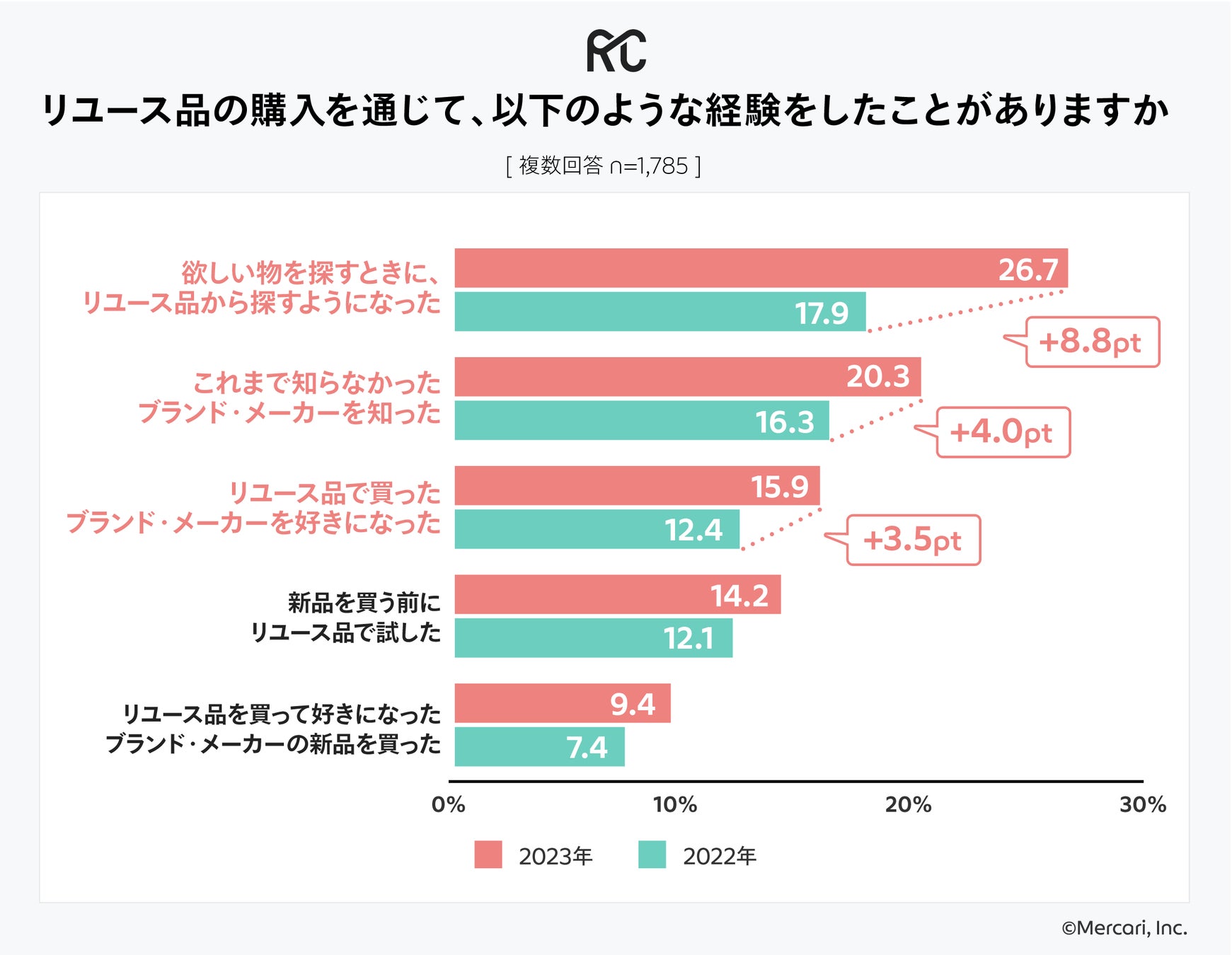 - リユース市場の拡大とともに、リユース品をきっかけにブランドを知ったり、ブランドを好きになったりする機会が昨対比で上昇。「欲しい物を探すときに、リユース品から探すようになった」(26.7%、+8.8pt)、「これまで知らなかったブランド・メーカーを知った」(20.3%、+4.0pt)、「リユース品で買ったブランド・メーカーを好きになった」(15.9%、+3.5pt)という結果に。