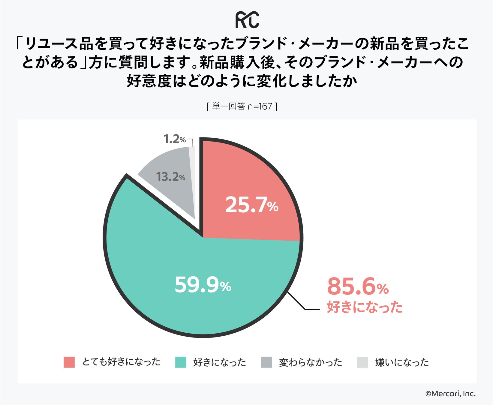 - 「リユース品を買って好きになったブランド・メーカーの新品を買ったことがある」人のうち85.6%は、新品購入後そのブランドを「とても好きになった」、「好きになった」と回答。リユース品を通じて、ブランド・メーカーへの好意度が上がることがわかりました。