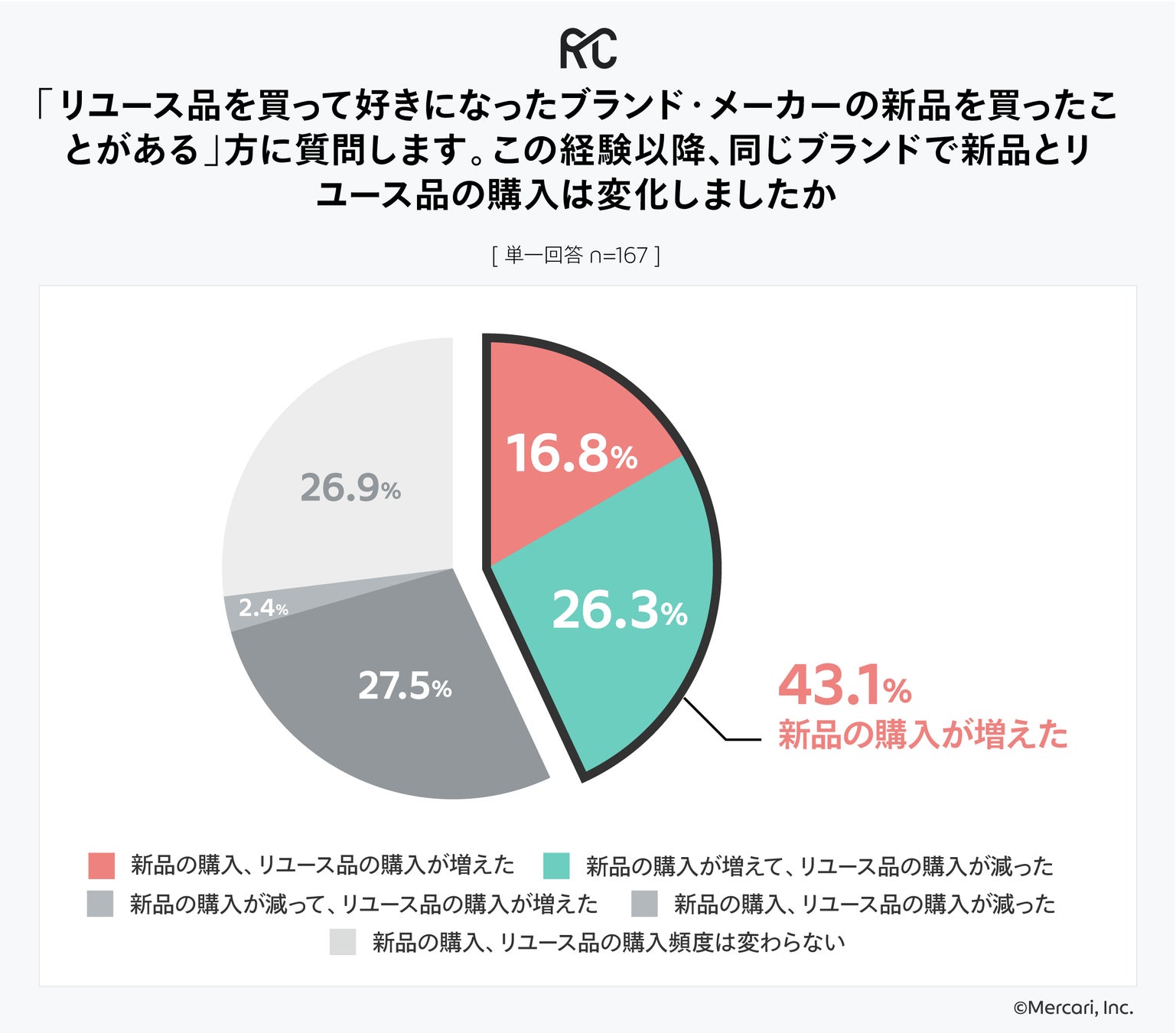 さらに、今回の調査では「リユース品を買って好きになったブランド・メーカーの新品を買ったことがある」人の内43.1%は、新品の購入が増えているという結果になり、リユース品によってそのブランドの新品購入が代替されているわけではないということがわかりました。