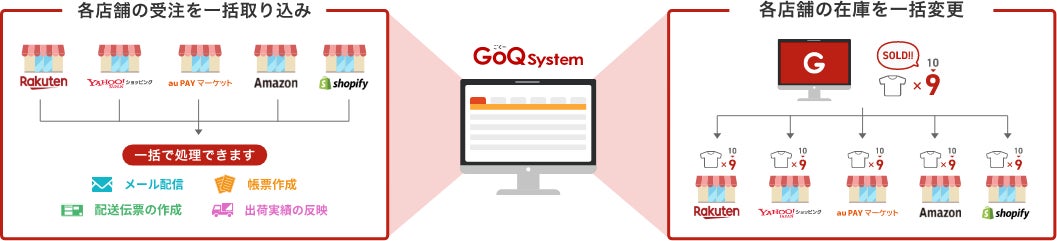 これにより、各店舗の受注を「GoQSystem」に取り込み、受注処理作業を一括で行うことができます。また、各店舗の販売データを「GoQSystem」に取り込み、在庫数を一括で変更することができます。