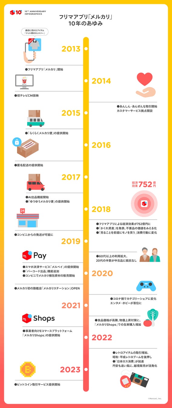 株式会社メルカリ(以下、メルカリ)は、7月2日をもってフリマアプリ「メルカリ」のサービス開始10周年を迎えます。これを記念して、10年のあゆみを振り返る「メルカリ」 サービス開始10周年インフォグラフィックスを公開しました。サービス初期と現在の取引状況、トレンドを比較し、変遷をたどります。