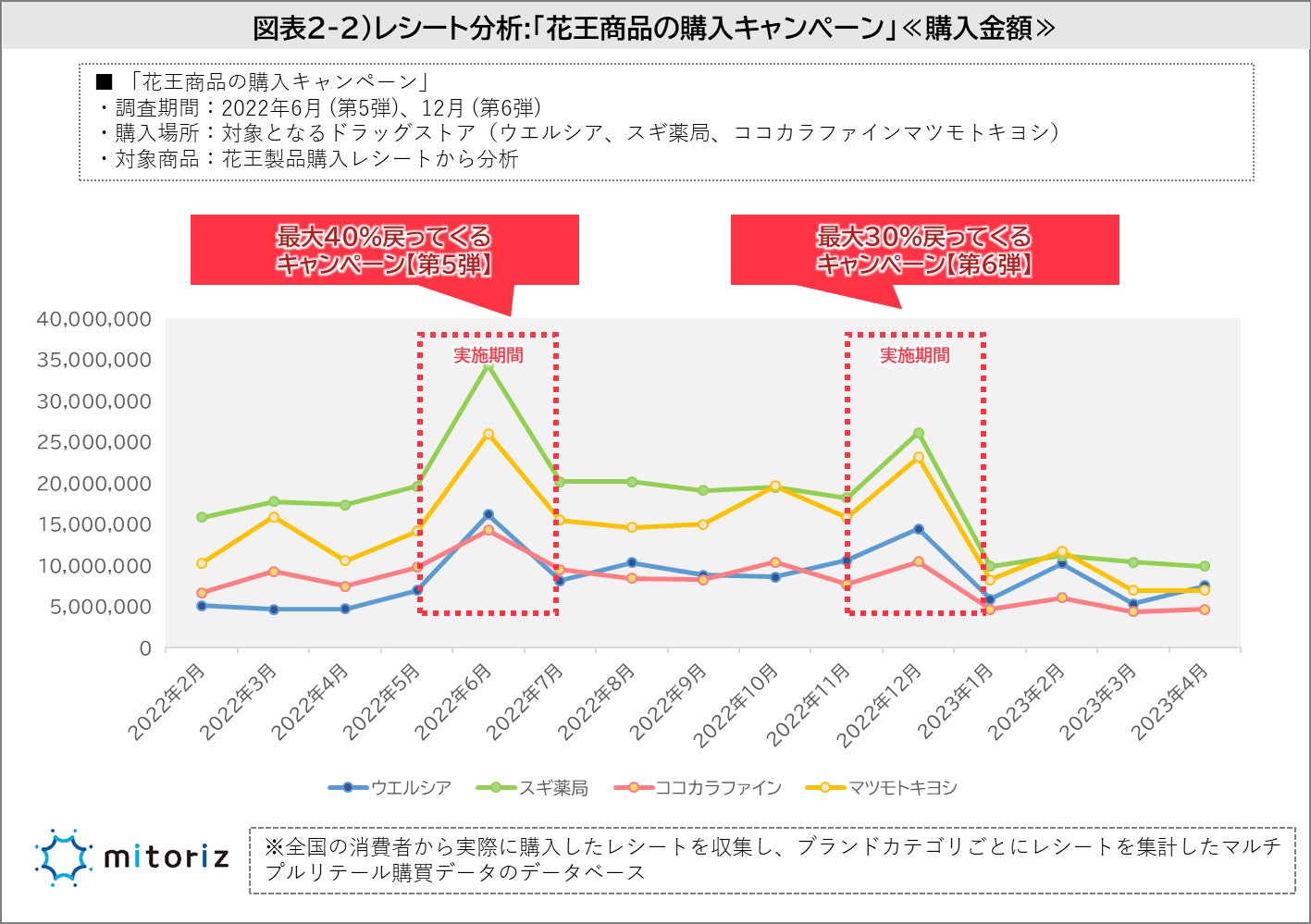 キャンペーンに合わせて「PayPay」での支払いが増えていることはわかりましたが、対象となる花王商品の購入金額への影響ついても検証しました。下図(図表2‐2)は、キャンペーンの対象となる花王商品が購入された金額を企業ごとグラフにしたものとなります。