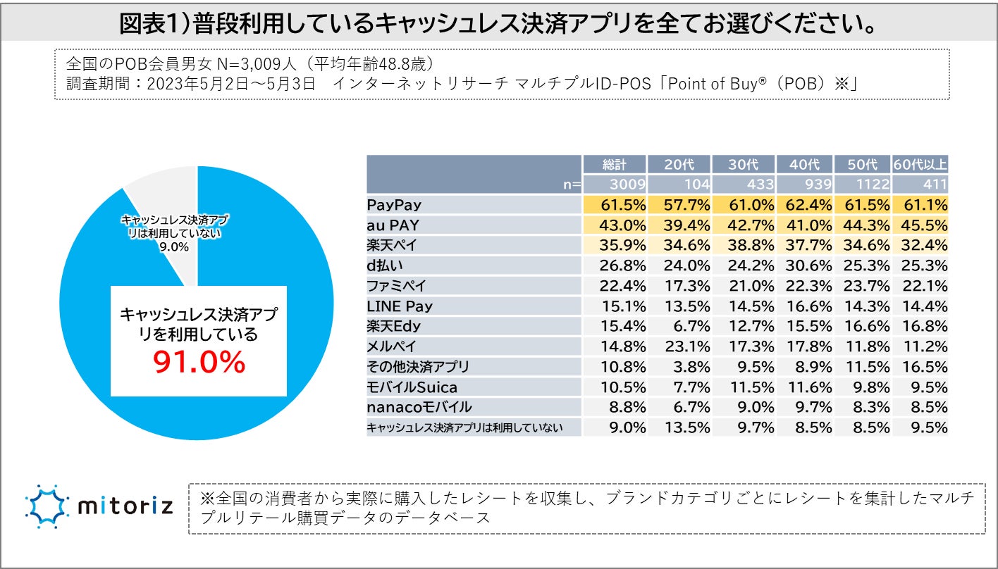株式会社mitoriz(本社:東京都港区、代表取締役社長:木名瀬博)は、消費者購買行動データサービス「Point of Buy®(以下、POB)」の会員3,009人に「キャッシュレス決済アプリに関する調査」を実施致しました。