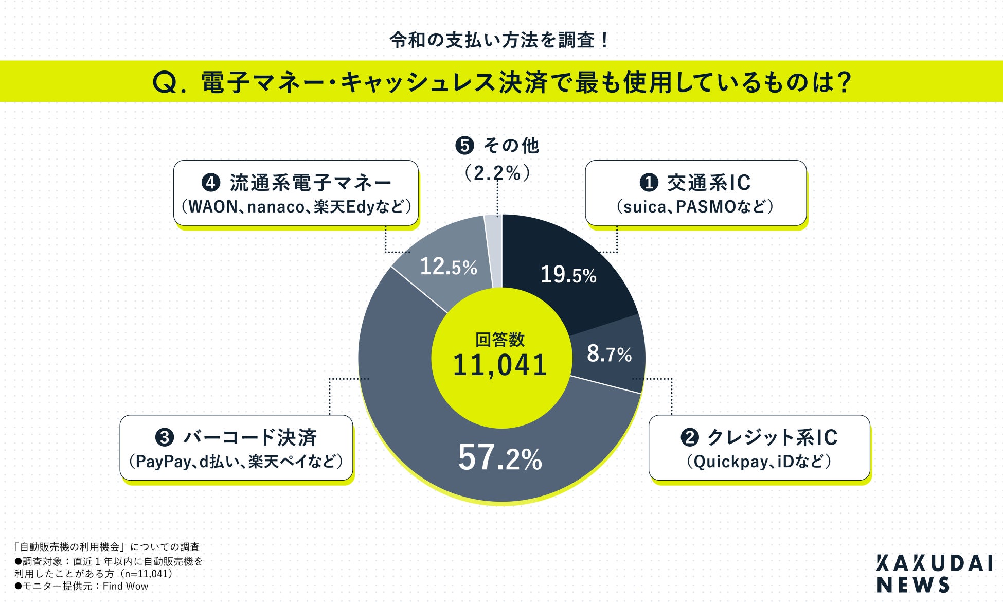 そこで「電子マネー・キャッシュレス決済で最も使用しているものは?」と聞いてみたところ、『バーコード決済(PayPay、d払い、楽天ペイなど)(57.2%)』と最多でした。