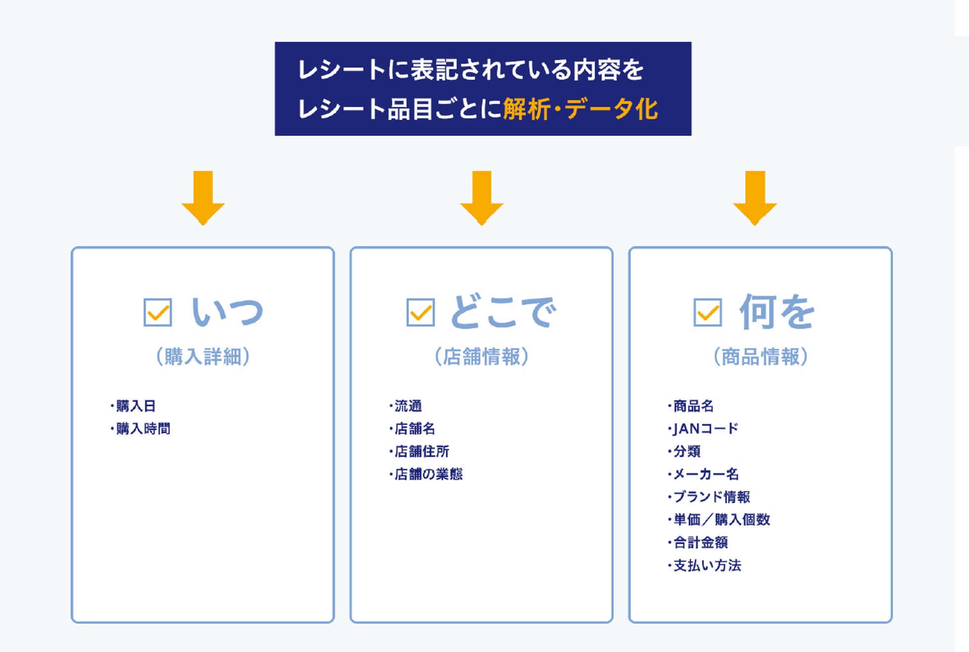 ◇レシデータによって、レシートから「いつ」「どこで」「何を」購入したか等の情報を読み解けるようになります。