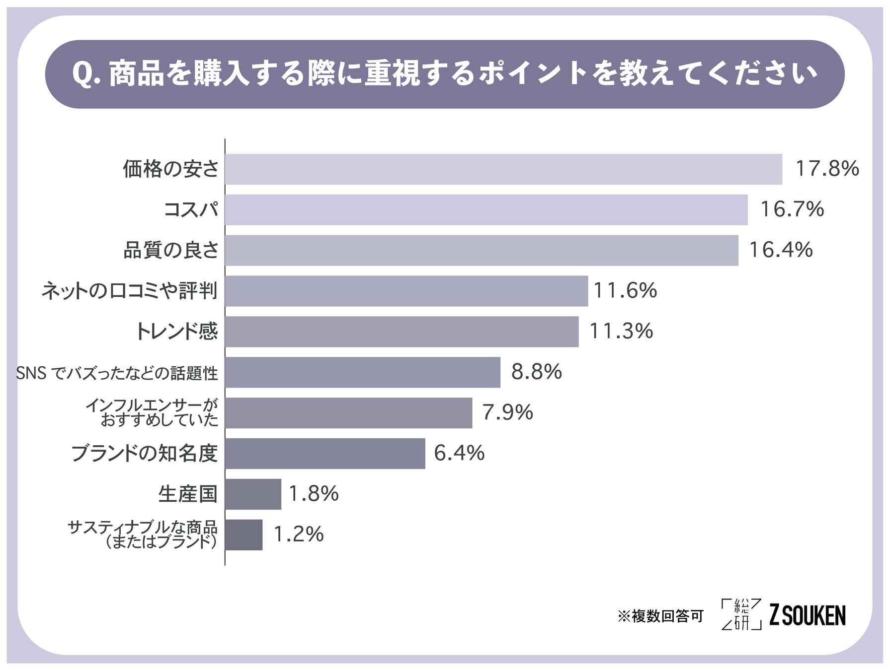 - 商品を購入する際に重視するポイントは、1位「価格の安さ(17.8%)」、2位「コスパ(16.7%)」、3位「品質の良さ(16.4%)」