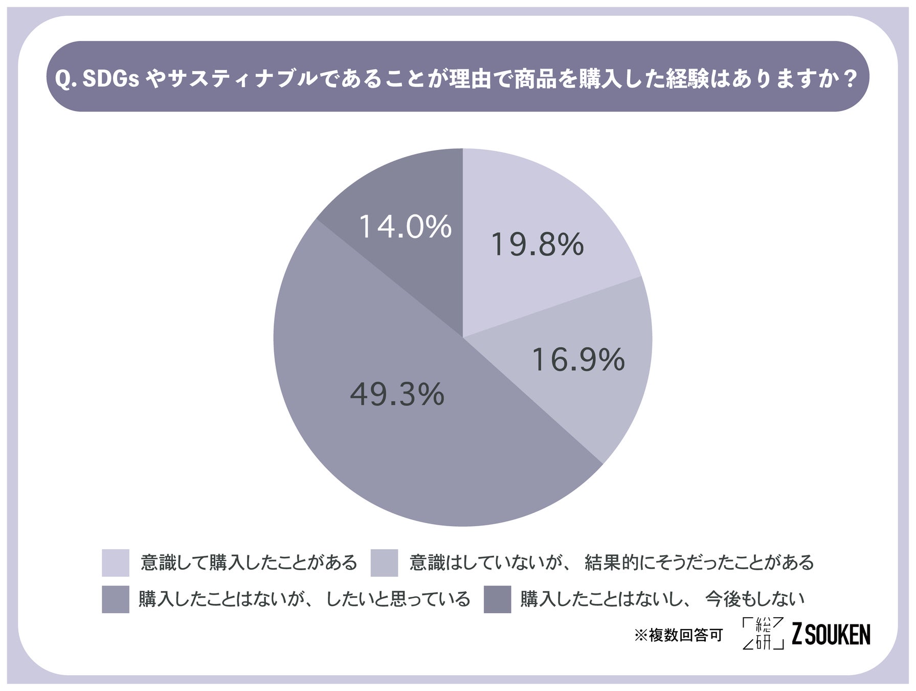 - 49.3%がSDGsやサスティナブルである商品を購入したことはないがしたいと思っている