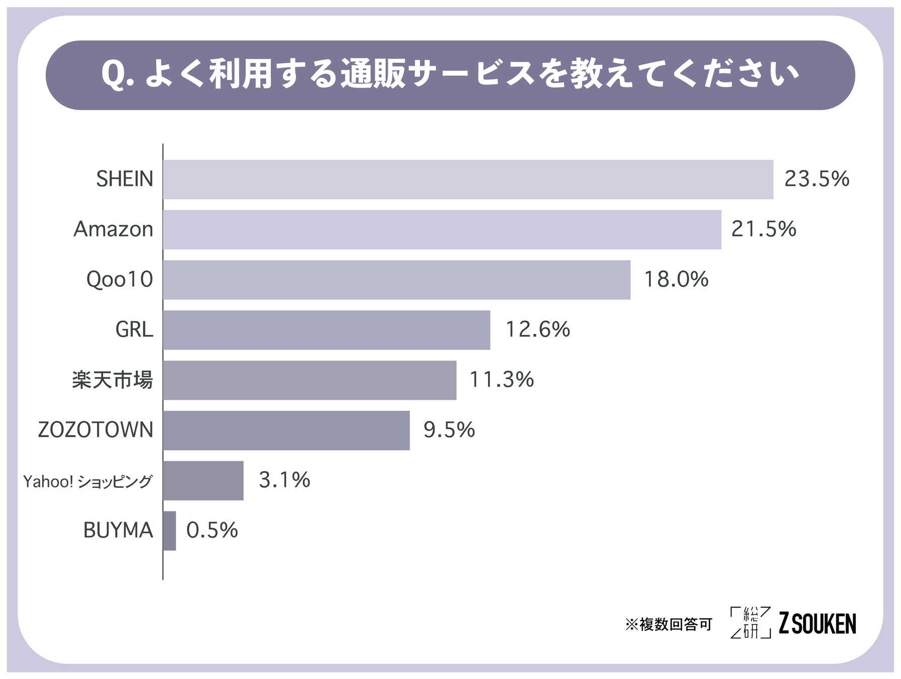 アンケートにて「よく利用する通販サービスを教えてください」と尋ねたところ、最も回答が多かったのが「SHEIN(23.5%)」、続いて「Amazon(21.5%)」、「Qoo10(18.0%)」という結果となりました。