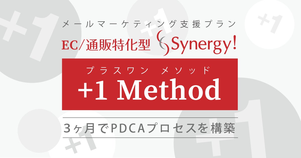 シナジーマーケティング株式会社(所在地:大阪市北区、代表:田代 正雄、以下当社)は、当社のクラウド型CRMシステム「Synergy!(読み方:シナジー)」を活用したEC/通販特化型メールマーケティング支援プラン「 Synergy! +1 Method(読み方:シナジー プラスワン メソッド、以下 +1 Method)」の提供を開始しました。+1 Methodは、メールマーケティングに課題を抱える EC/通販事業者様に特化したコンサルティングプランです。3ヶ月の短期間でメールマーケティングの基礎から運用設計までを当社独自の標準知識体系を集約して提供し、実務改善と成果向上に貢献します。