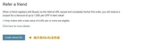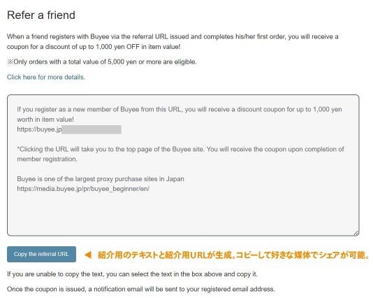 ①Buyeeユーザーは、マイページから紹介用URLを取得。SNS、メールなどでお友達にBuyeeをシェア