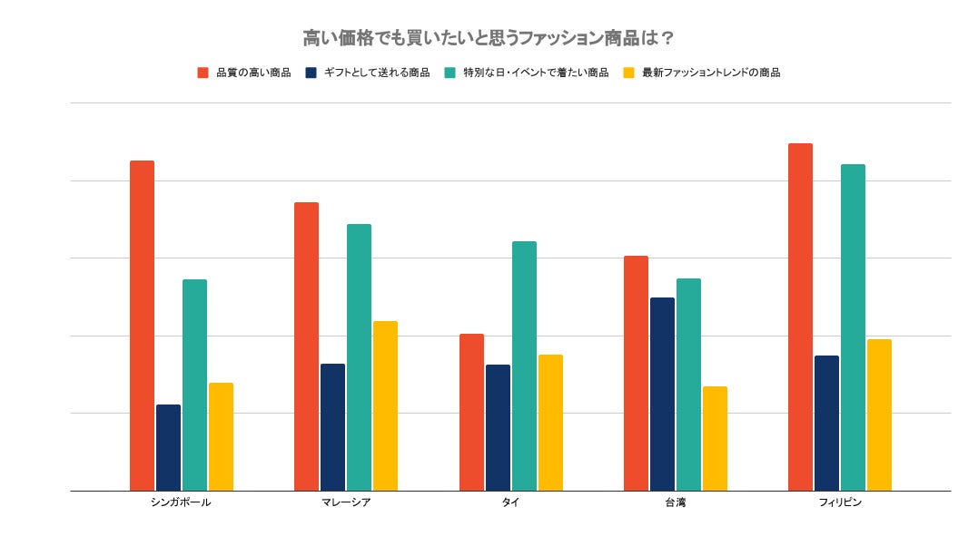 Shopeeで販売可能な市場の消費者の多くは、品質が高いことが認識できる商品に対しては、高い価格でも躊躇なく購入しています。また、これらの市場では、特別な日やイベントのために、高額なファッション商品を購入する傾向があることも見えています。