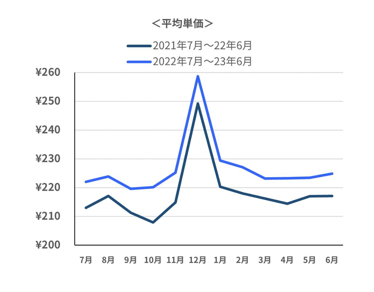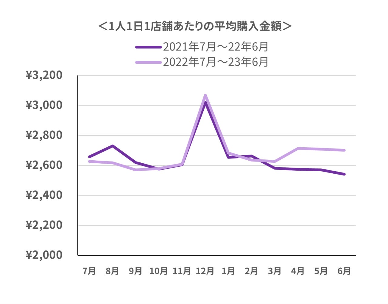 2023年6月のデータ調査の結果、平均購入金額は前年同月比約6.2%(+159円)増加、今年平均購入金額が増加に転じた3月と比較しても、約2.9%(+75円)上昇しています。
