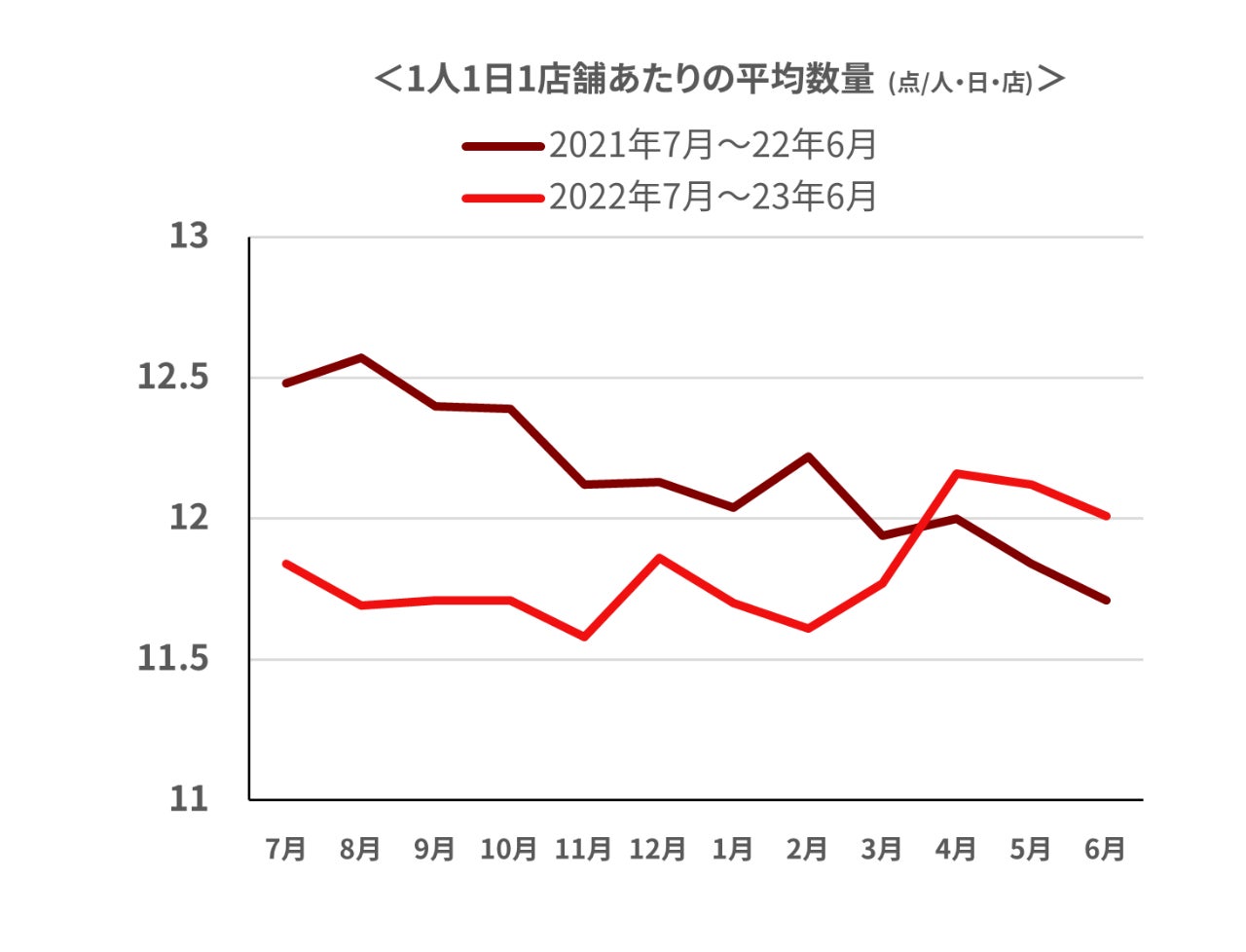 平均購入金額を構成するそれぞれの要素を見てみると、6月の平均単価は前年同月比約3.6%(約+7.7円)増、平均購入数量も同様に約2.6%(約+0.3点) 増加しております。