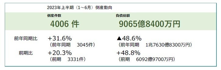 2023年上半期の倒産件数は4006件(前年同期3045件、31.6%増)となり、上半期としては6年ぶりに前年を上回った。2023年3月に800件を記録して以降、月次ベースで600件を超える件数で推移したこともあり、上半期としては5年ぶりに4000件超えとなった。