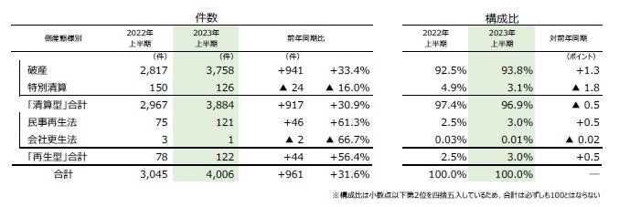倒産態様別にみると、『清算型』倒産の合計は3884件(前年同期2967件、30.9%増)となり、全体の96.9%(対前年同期0.5ポイント減)を占めた。『再生型』倒産は122件(同78件、56.4%増)発生し、上半期としては4年ぶりに前年を上回った。