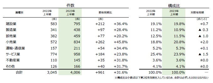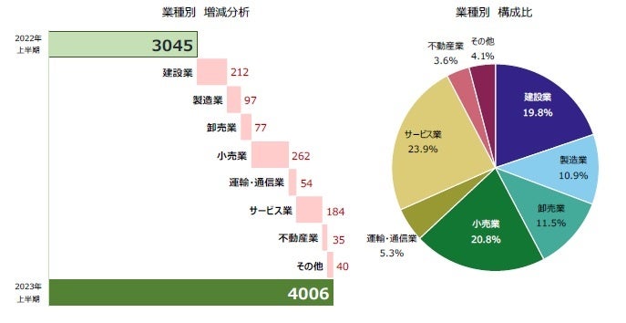 業種別にみると、上半期としては2009年以来、14年ぶりに全業種で前年を上回った。『サービス業』(前年同期774件→958件、23.8%増)が最も多く、『小売業』(同572件→834件、45.8%増)と『建設業』(同583件→795件、36.4%増)の2業種は、前年同期から200件を超える大幅増だった。『運輸・通信業』(同157件→211件、34.4%増)は、上半期としては9年ぶりに200件を超えた。