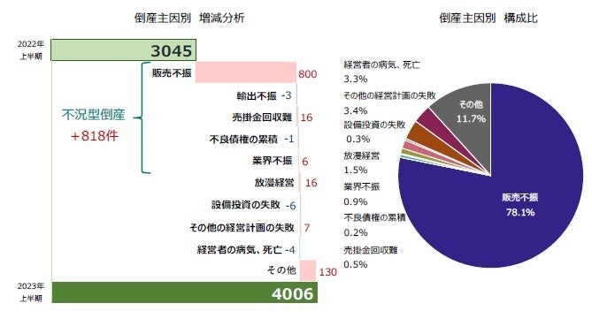 主因別にみると、「販売不振」が3130件(前年同期2330件、34.3%増)で最も多く、全体の78.1%(対前年同期1.6ポイント増)を占めた。「売掛金回収難」(前年同期6件→22件、266.7%増)や「業界不振」(同31件→37件、19.4%増)などを含めた『不況型倒産』の合計は3197件(同2379件、34.4%増)となり、上半期としては2年連続で前年を上回った。