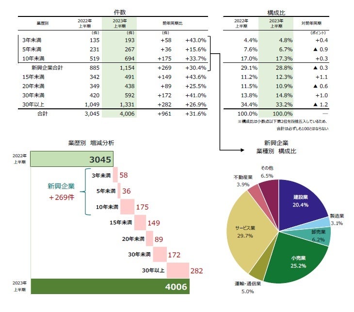 業歴10年未満の『新興企業』[「3年未満」(前年同期135件→193件、43.0%増)、「5年未満」(同231件→267件、15.6%増)、「10年未満」(同519件→694件、33.7%増)]は1154件(前年同期885件、30.4%増)と、上半期としては2年連続で前年を上回った。内訳を業種別にみると、「サービス業」(同285件→343件、20.4%増)が最多、「小売業」(同181件→291件、60.8%増)、「建設業」(同186件→235件、26.3%増)と続いた。