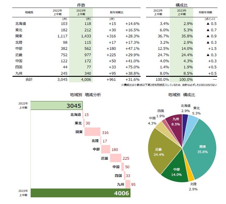 6. 地域別にみると、全地域で前年同期を上回った。『東北』(前年同期182件→212件、16.5%増)、『関東』(同1117件→1433件、28.3%増)、『中部』(同382件→562件、47.1%増)、『九州』(同245件→340件、38.8%増)の4地域は、コロナ禍前の2019年上半期を超えた
