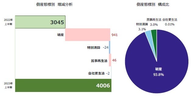 『清算型』では、「破産」が3758件(前年同期2817件、33.4%増)で最も多く、上半期としては2009年以来14年ぶりに900件を超える増加幅を記録した。「特別清算」は126件(同150件、16.0%減)と、上半期としては2年連続で前年を下回った。