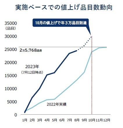 2023年の値上げが3万品目を超えた。家庭用を中心とした飲食料品の2023年値上げ品目数は、7月12日までの判明ベースで累計3万9品目に上った。全食品分野に及ぶ年3万品目超の値上げはバブル崩壊以後の30年間でも異例で、記録的な22年(2万5768品目)を上回り過去最大級の値上げラッシュとなる。特に10月は、酒類やソーセージ、調味料などを中心に3716品目が既に値上げ予定となり、最大で1年前と同水準の8000品目台に到達する可能性がある。