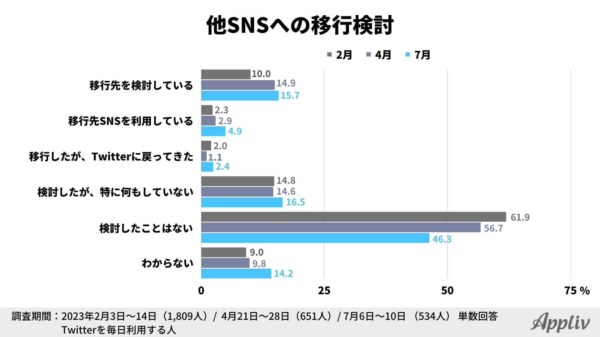 「検討したことはない」と回答したのは46.3%と前回調査から10.4pt減少し、過去最も少ない結果となりました。他SNSへの移行を検討する人が少しずつ増加し続けている状況から、徐々に「Twitter離れ」が進んでいると考えられます。