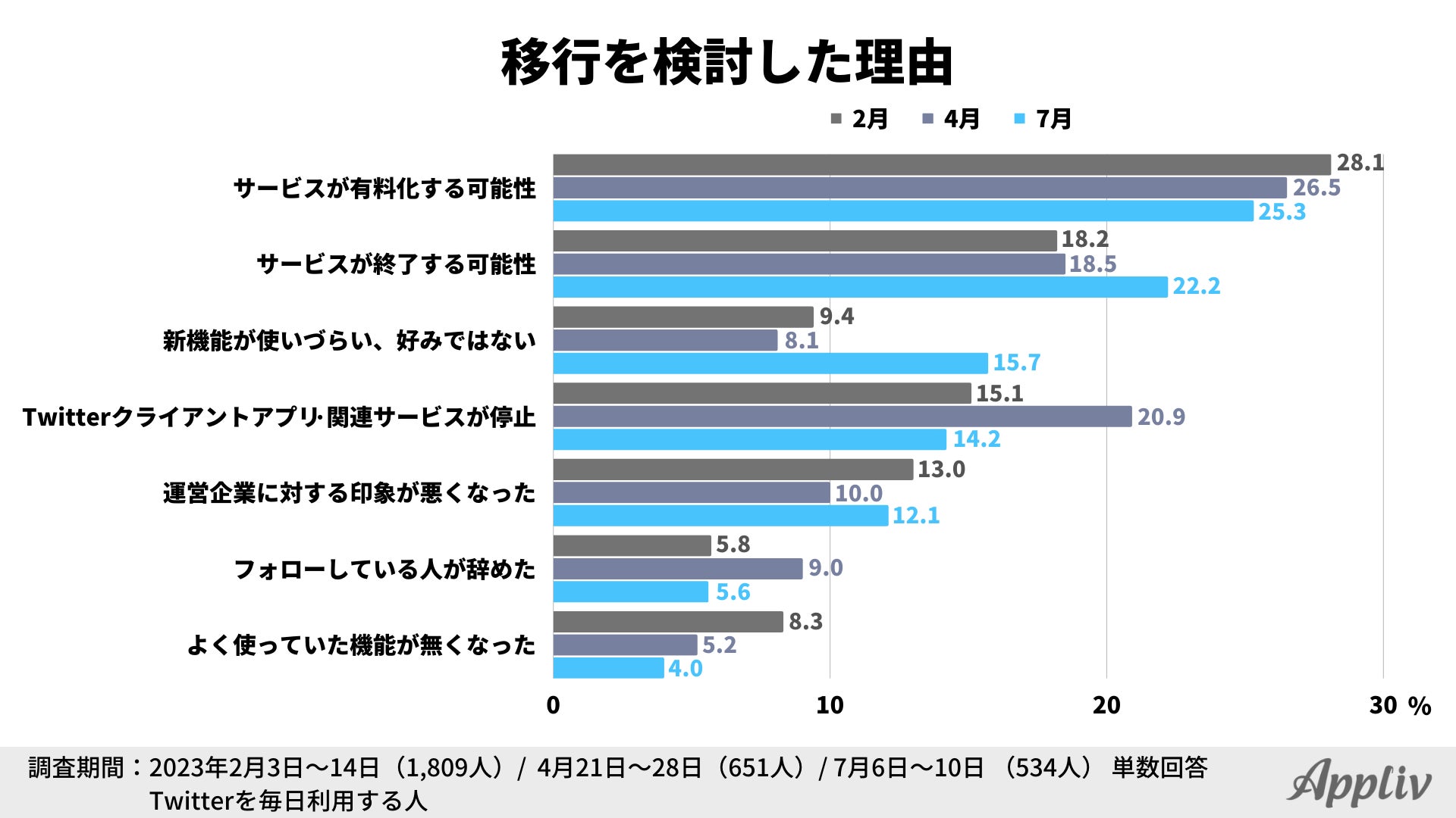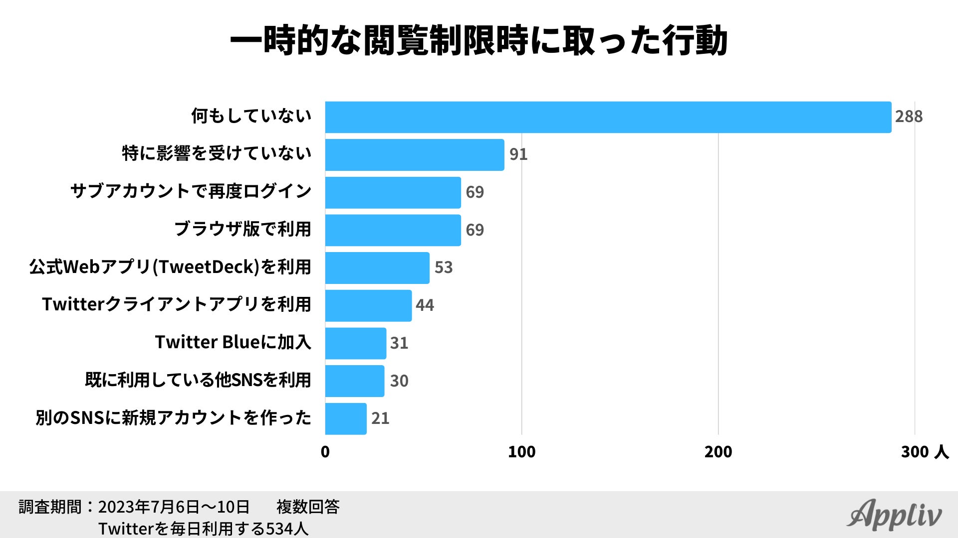 イーロン・マスク氏による買収以降、Twitterの仕様変更が相次いでおり、今後の動向に引き続き注目が集まっています。7月1日(現地時間)には事前予告なしに一時的な閲覧制限が行われ、多くのユーザーに混乱を招きました。Applivでは2023年2月よりTwitterの利用状況に関する調査を実施しており、4月に続き3回目となる調査の結果を公開します。