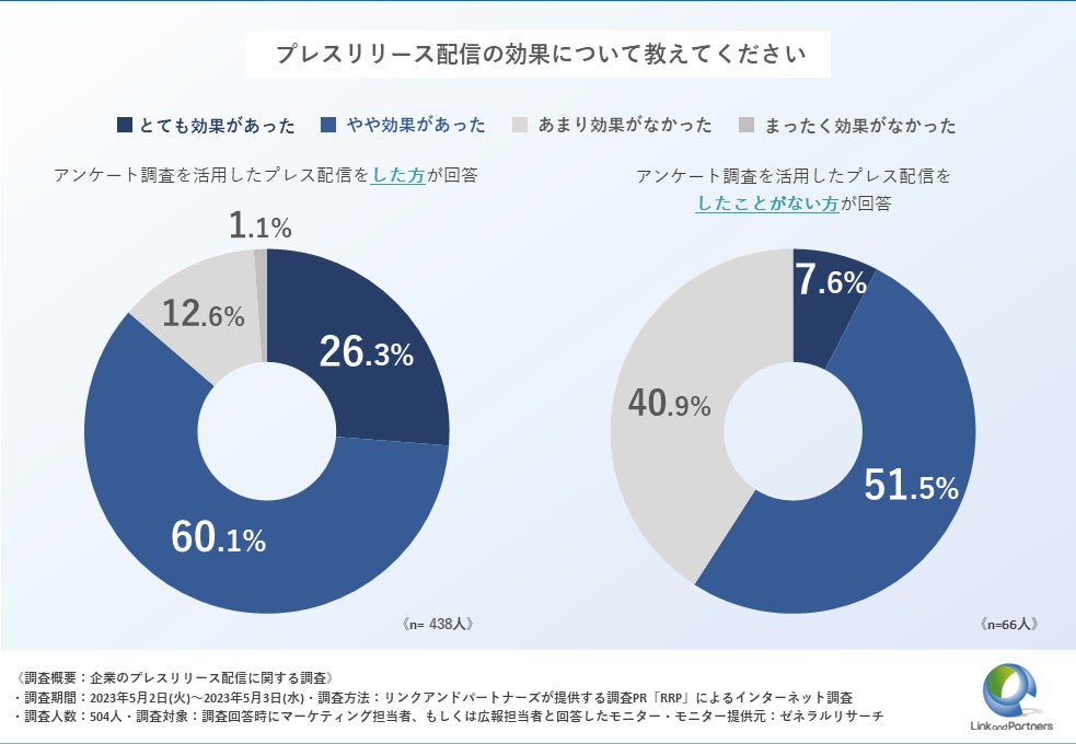 上記の質問において、「アンケート調査を活用したプレス配信をした方」の方が「したことがない方」と比べて、「効果がある」と回答した割合が約30%高いことが分かりました。