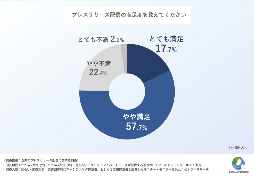 「Q4:プレスリリース配信の満足度を教えてください」と質問したところ、「とても満足」が17.7%、「やや満足」が57.7%、「やや不満」が22.4%、「とても不満」が2.2%という回答となりました。