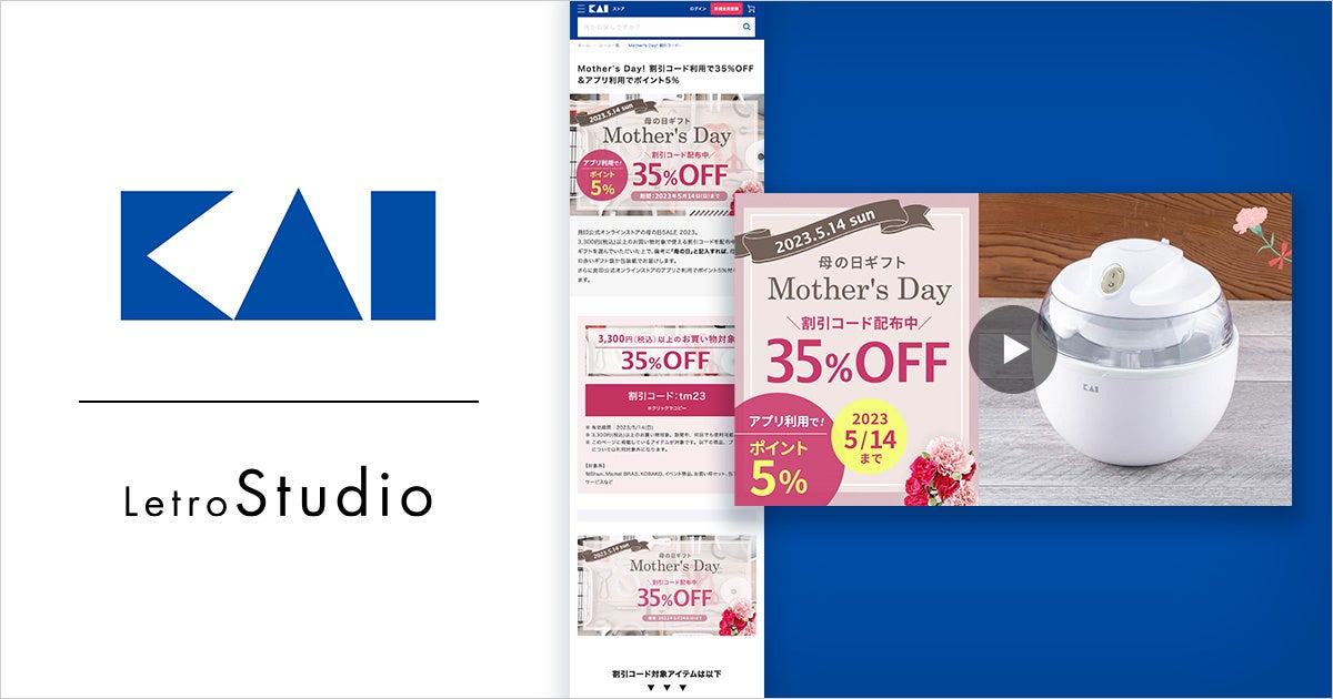 LetroStudioを活用して、公式オンラインストアの「母の日SALE 2023」特設ページに掲載する動画コンテンツを制作しました。動画コンテンツには割引の訴求に加えて、セール対象商品をスライド形式で紹介することでユーザーの関心を引きつけることに成功。同ページ内において、「静止画コンテンツ」と「LetroStudioで制作した動画コンテンツ」を比較するA/Bテストを実施したところ、動画コンテンツの方がページ滞在時間が115%に向上するなど、好調な結果となりました。