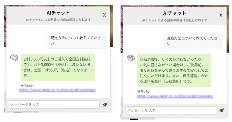 『AIデジタルスタッフ』では、商品に対する質問はもちろん「配送方法」や「支払方法」「ログイン方法」「会社概要」「店舗」などの一般的な質問やサイトに存在するコンテンツの検索に対しても概ね問題なく回答が可能となります。