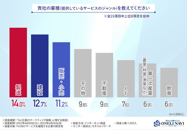 「貴社の業種(提供しているサービスのジャンル)を教えてください」と質問したところ、『製造(14.0%)』と回答した方が最も多く、次いで『建設(12.7%)』『販売・小売(11.2%)』『不動産(9.0%)』『IT(7.6%)』と続きました。