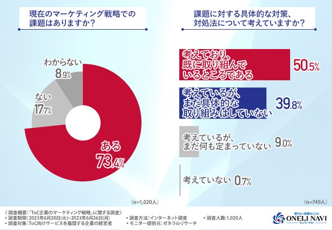 ここまでの調査で、マーケティング戦略の課題に取り組んでいる企業が半数ある一方、解決方法を考えてはいるものの、実行までにはいたっていない企業もおよそ半数あることが明らかになりました。